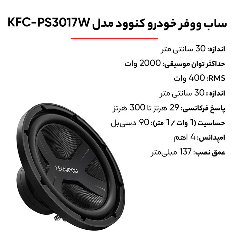 ساب ووفر کنوود مدل 3017 ساب 12 اینچی قدرتمند شرکت کنوود است. که در سال 2021 توسط شرکت کنوود به بازار عرضه شده است. این ساب ووفر از سری ساب های قدرتمند و بسیار خوش صدای شرکت بزرگ Kenwood است. که توسط این شرکت به بازار عرضه شده است. این مدل را می توان یکی از موفق ترین و پرفروش ترین مدل های جدید کنوود در ایران نامید.