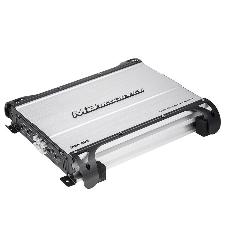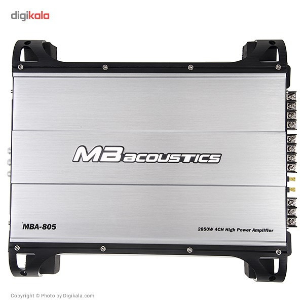 یکی از آمپلیفایرهای خودروی کمپانی «ام بی آکوستیکس»، (MB Acoustics) مدل «MBA-805» است که با طراحی جالبی تولید شده است. این محصول، با بیشینه توان خروجی 2850 واتی خود، در سطوح بالای صدا عملکرد مناسبی را ارائه میکند و قدرت اسپیکرها را تقویت میکند. این آمپلیفایر از نوع 4 کاناله بوده و با توجه به این ویژگی، دارای بدنهای مستطیل شکل است. همچنین، اعوجاج ناچیز این مدل، باعث میشود که صدا با کمترین نویز ممکن به پخش درآید. پاسخ فرکانسی این مدل نیز از 10 تا 50000 هرتز است و صدا را در این رنج پخش میکند. کیفیت ساخت بالای این مدل باعث شده است که از دوام بالایی برخوردار شود و خیال کاربران را بابت استفادهی طولانی مدت از این محصول آسوده باشد. لازم به ذکر است که این آمپلیفایر برای کاربران عادی مناسب بوده و به راحتی نیاز آنها را برآورده میکند تا بتوانند از حداکثر توان اسپیکرهای خود بهرهمند شوند.